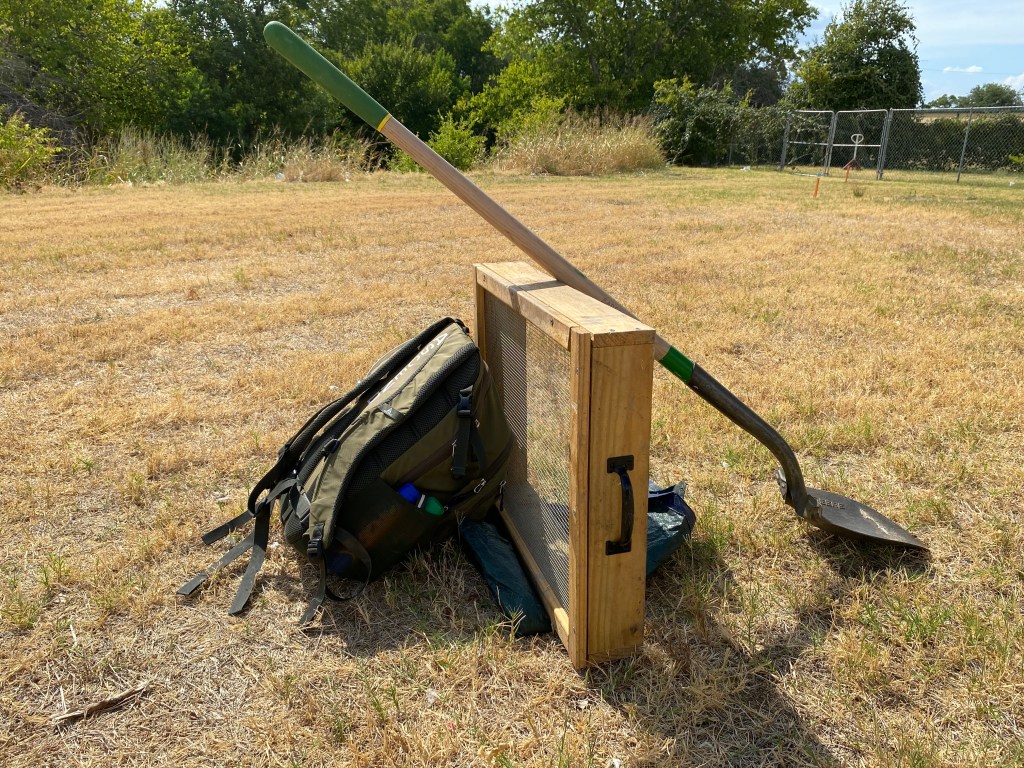 Many surveys require some form of subsurface testing, usually in the form of shovel testing, which means that the archaeologists periodically stop to dig holes by hand and sift the excavated soil through hardware cloth screens. They have to carry their shovels and screens with them as they trek across their survey areas.