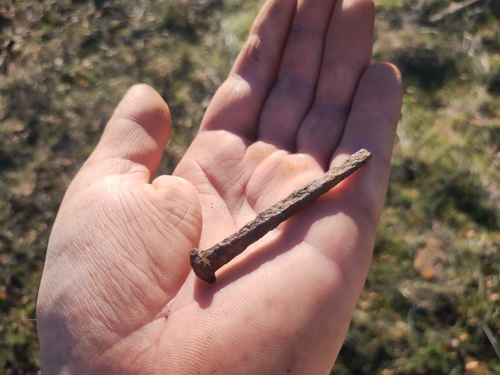 One type of metal implement that we frequently find at historic sites is the nail. The earliest nails were hand-forged out of wrought iron by blacksmiths. These nails typically have a square-shaped cross section and a pyramid-shaped head, called a “rose head.” Later, manufacturers used machinery to cut nails out of metal plates. These nails are also square-shaped, but they have flat heads. After the end of the 19th century, manufacturers switched to making the wire nails that we still use today (these have a round cross-section).