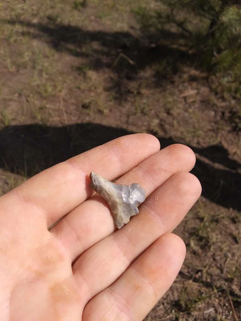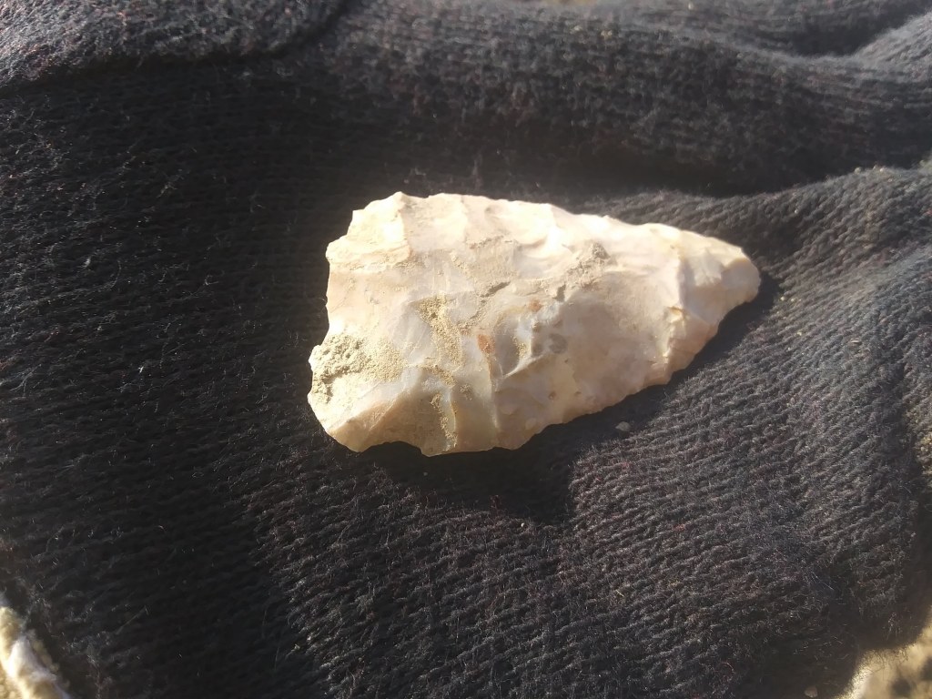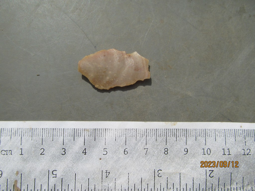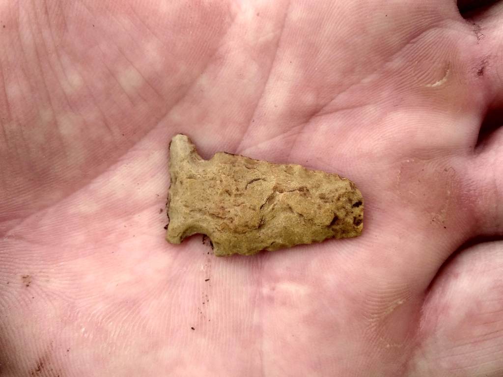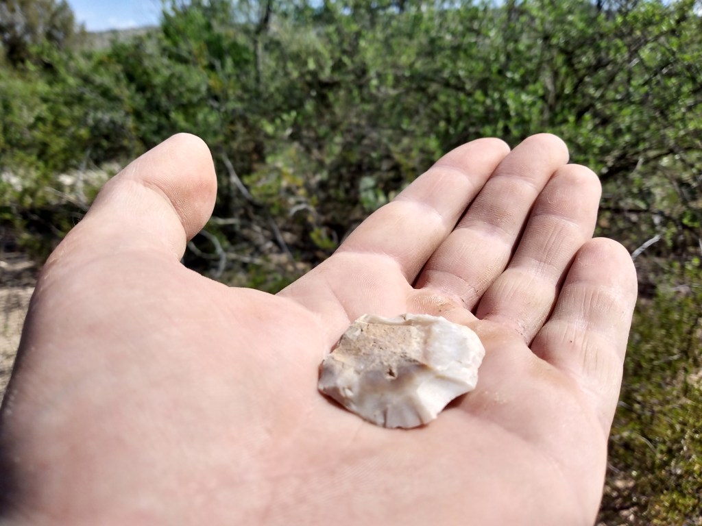 Here’s a general rule about finding artifacts during archaeological surveys. When it comes to pre-Columbian artifacts, the main difficulty lies in distinguishing man-made artifacts (especially debitage) from naturally broken pieces of rock. If you can’t distinguish a flake from a naturally occurring broken rock, you won’t even realize you’re standing on an archaeological site. But if you are able to determine that the broken rock in your hand is actually a piece of debitage, you can be reasonably sure that this is a pre-Columbian artifact that should be recorded (though there are modern flint knappers who probably leave their flakes on the ground too, and there were even some historic flint knappers who made gun flints for flintlock rifles).