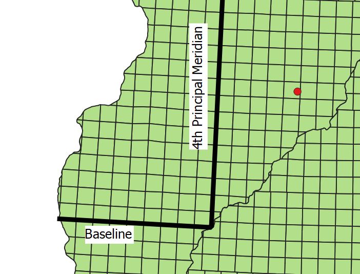 The state of Illinois is further divided by township. Essentially, it is divided into a set of perfect township squares, with each square covering 36 square miles (6 miles by 6 miles on each side). Each one of these squares is assigned two numbers—one for “township” and one for “range” (but the individual squares are generally just called townships). The “township” number indicates how far north or south the square is, and the “range” number indicates how far east or west it is. The township number is counted from an imaginary line called a baseline, which runs from east to west (for example, if the township unit is labeled as 9 N, that means its northern boundary is 54 miles north of the baseline). The range number is counted from an imaginary line called a principal meridian (for example, if the unit is labeled as 5 E, that means its eastern boundary is 30 miles east of the principal meridian).