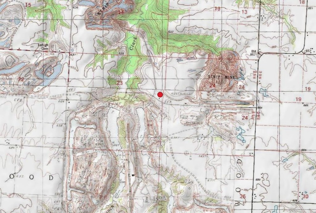 To help you better visualize how this geospatial data is collected and submitted, I’m going to show you the location of an abandoned brick grain silo in rural Illinois, imposed over a USGS topographic map. I can’t show you the location of a real archaeological site that has been recorded in a database, because that information is confidential. As I’ve already explained, the locations of archaeological sites are not made available to the general public, due to the prevalence of looting. But there’s probably no harm in showing you the location of this old silo, given that it is fully visible from a public road (even though it could technically be considered a historic archaeological site, as it was built around the year 1900). It contains nothing of monetary value, and if you feel an urge to trespass there, be aware that the current landowners probably have a lot of guns, as is customary in rural Illinois.
