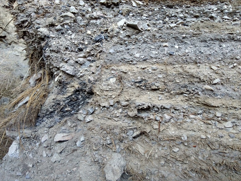 The sediment on the floor of a rockshelter can either be “endogenous” or “exogenous.” Endogenous sediment is sediment that has originated within the rockshelter itself—often, falling down from the ceiling. Natural weathering causes small particles of rock and pieces of rubble to break away from the overhanging ledge and fall to the floor of the shelter. We call this “rock fall.” These particles will gradually bury artifacts or features left on the floor.