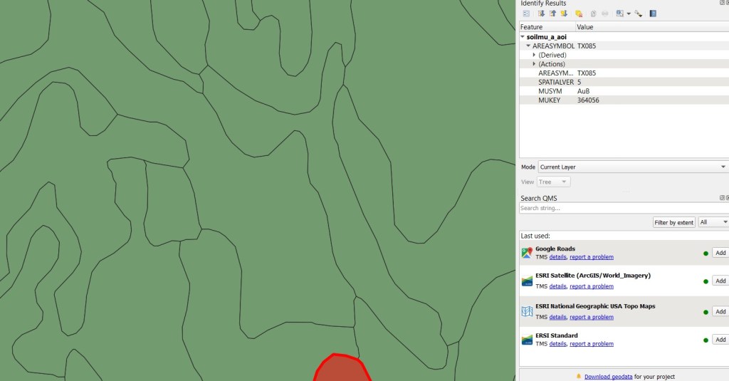 Now let’s look at a map of those NRCS soil units, with the TxDOT PALM data removed. I’ve selected one of the soil map units that was beneath the selected high-probability area. If you look to the right of the map, you’ll see that the Soil Map Symbol is HoB2, one of the symbols for “Houston Black clay.”