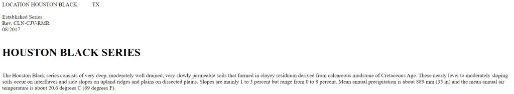 If you look up the page for the Houston Black series, the very first sentence tells you how Houston Black soil formed: “in clayey residuum derived from calcareous mudstone of Cretaceous Age.” In other words, Houston Black is a residual soil that formed in situ from weathered bedrock. In this case, that bedrock is mudstone. Basically, the mudstone weathered into dark clay over time. That clay was not deposited from elsewhere (the sediment that initially formed the mudstone was transported from elsewhere, but that happened over 65 million years ago). This means, if you are shovel testing or excavating in soil that has been mapped as Houston Black, you can expect all the artifacts to be located on the surface or in the topsoil. There is little to no possibility for deeply buried artifacts, because artifacts would have been buried by bioturbation, not by the introduction of new sediment. There can still be quite a high possibility for buried artifacts if there’s a lot of vegetation, but those artifacts won’t be deeply buried. I would expect to find them in the top 20 cm.