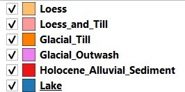 The light brown units represent the upland areas where periglacial loess is lying directly on the surface. The orange units represent the slopy areas where glacial till is still exposed on the surface, unburied by loess, and the pink units represent the transitional areas that consist of both loess and glacial till. There are a couple of purple units that represent pockets of glacial outwash. The red units represent a Holocene floodplain along the banks of Senachwine Creek and one of its tributaries.