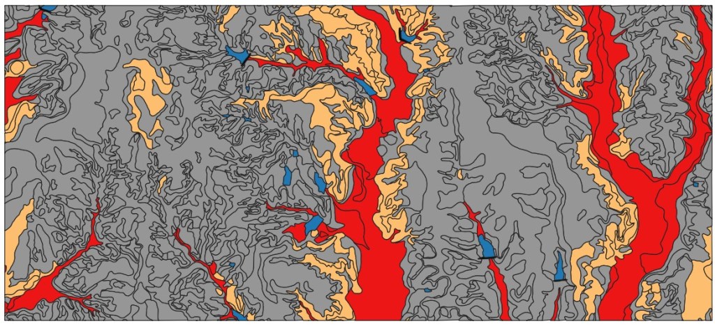 In the above map, I’ve classified each soil unit in the project area according to its formation. The soils here consist of residual soils, ancient alluvium, Holocene alluvium, and standing water. The gray units consist of residual soils. The light brown units represent ancient alluvial terraces, now heavily weathered and eroded. The red units represent floodplains consisting of Holocene alluvium. It might be difficult to tell from the map, but the residual soils are found on the upland areas. The Holocene floodplains are located along existing creeks. And the ancient alluvial terraces are generally located roughly alongside the current floodplains.