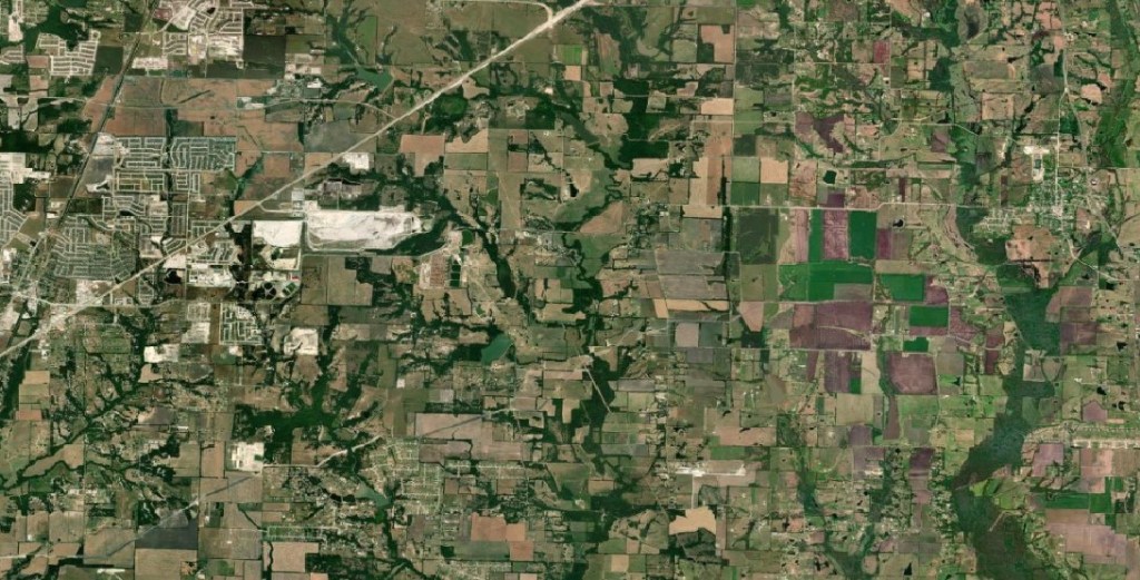 To help you visualize this a little better, I’m going to show you the downloaded soil data for a hypothetical survey area in Collin County, Texas. Below, you can see the satellite imagery of the project area—a patchwork of farmland and pasture between the towns of Melissa and Blue Ridge: